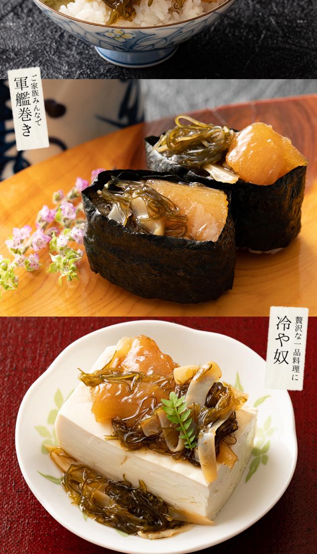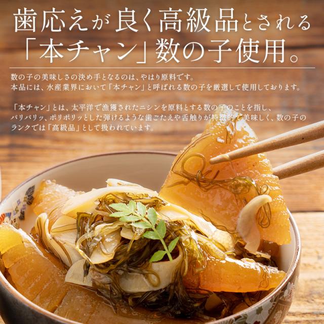 数の子、しょうゆ、するめ、砂糖、昆布、米発酵調味料、食塩、唐辛子、甘味料、酒精、調味料(アミノ酸等)、増粘多糖類、pH調整剤(一部に小麦・大豆・いかを含む)