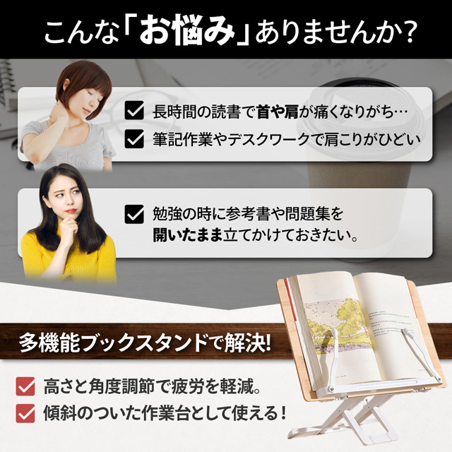 【安心設計、便利さを追求】 ・大きく重い本も倒れにくい安心設計。ストッパーの先端は回転するので片手でページめくりが可能です。