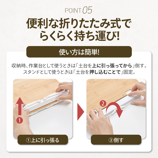 【折りたたみ可能】 ・土台の部分は折りたためるので収納も簡単、持ち運びも可能です。