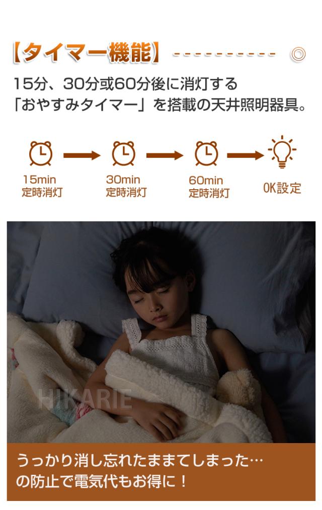 30分或60分後に消灯する「おやすみタイマー」を搭載の天井照明器具。うっかり消し忘れたままてしまった…の防止で電気代もお得に!