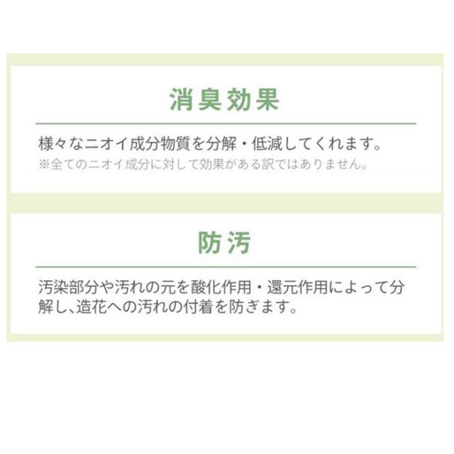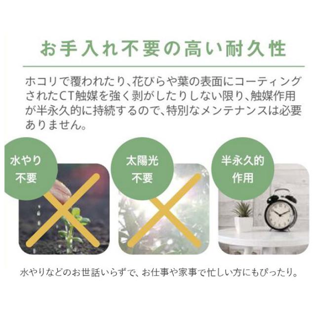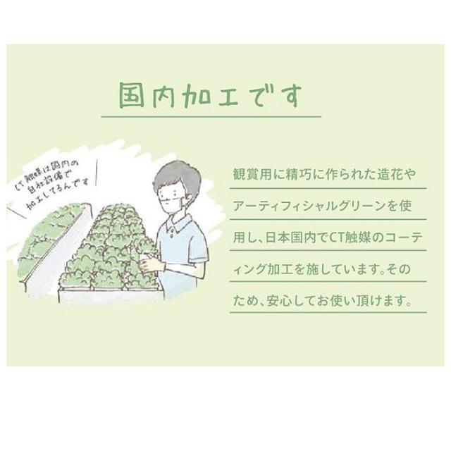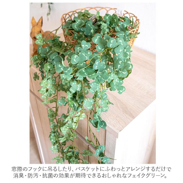 | 商品説明 | ・壁や窓辺に吊り下げたグリーンが、お部屋の空気をキレイに変える♪「エクリアgreenery life」から、「消臭アーティフィシャルグリーン・ハンギングタイプ」が新登場。 ・窓際のフックに吊るしたり、バスケットにふわっとアレンジするだけで消臭・防汚・抗菌の効果が期待できるおしゃれなフェイクグリーン。 ・エクリアは、見た目の華やかさだけではなく「CT触媒加工」が施された、機能的な人工観葉植物シリーズ。お部屋の消臭効果だけでなく、その抗菌作用で細菌やカビの増殖も防止! 「CT触媒」とは、生体必須ミネラルに含まれる元素から厳選したミネラル複合体のこと。非常に安全性が高く、人体にも無害なので、小さなお子さまやペットのいるご家庭でも安心。 ・CT触媒は、ホコリに埋もれない限り半永久的に効果を発揮!光のない暗い場所でも効果が続くため、お手洗いや玄関に飾ってもOK! ・ボリューム感のある長さで、空間を緑の爽やかな印象で彩るロングスワッグ(壁飾り)タイプ。 ・すぐに飾れるフック付きなので、カーテンレールやウォールフックにはもちろん、ライティングレールに吊るして照明と並べたり、お好みの場所でアレンジ自在。 ・まるで本物の植物のようなタッチでつくられた観葉植物の定番「アイビー」や「シュガーバイン」など、ナチュラルな風合いが楽しめるラインナップ。 ・水やりなどのお世話いらずで、お仕事や家事で忙しい方にもぴったり。インテリアのワンポイントに飾れば、手軽にグリーンのある暮らしが叶う♪ |