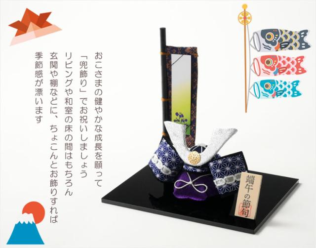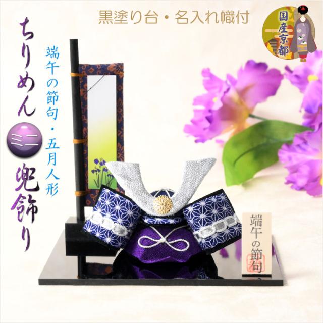 国産・節句飾り【端午の節句:国産京都 幟付き・ちりめんミニ兜飾りセット 紺色】卓上飾り 節句人形 こいのぼり 五月人形 五月飾り 昇鯉 男の子 室内飾り 菖蒲の節句