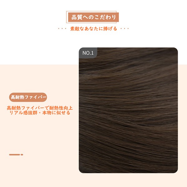 厳選高品質素材:ウィッグ特性高級材質カネカロンを使用しております。さらさらで自然な手触りで、通気性も良好です。さらに、耐熱180℃以内でドライヤー.アイロン使用可能にアレンジできます。人工頭皮を採用し、つむじもとても自然です。人毛に近いしっとりとした自然な手触りを実現。形状記憶に優れ、スタイルが崩れにくく、お手入れにも手間がかかりません。美容室で染めたような自然な発色を再現しています。