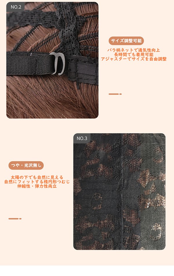 サイズフリー:伸縮性のメッシュ素材で作られていて、またアジャスターがつけられています。頭のサイズや毛量に合わせて、フックの位置でサイズ調節の可能です。伸縮自在のアジャスターで頭の大きさや形によって柔軟にフィットさせられます。日常生活でも使いやすく、流行に左右されないからこそ、長く愛用できるウィッグです。イベント・パーティー・学校などいろいろな場合にオススメです。