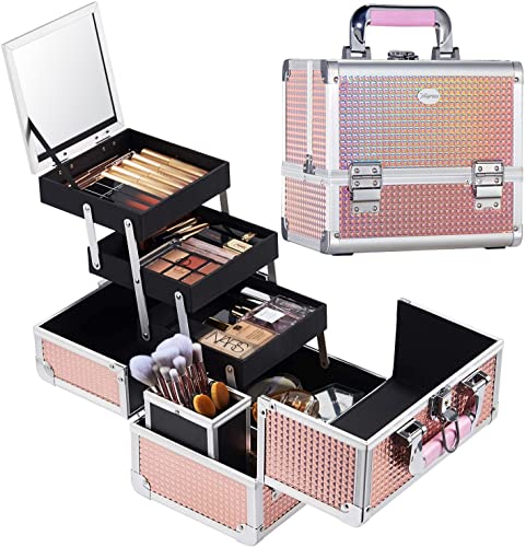 【大容量で収納力抜群】三段式のスライドトレイとワイドな底部は抜群な収納力を持っております、化粧水・乳液・下地・ファンデ・ルースパウダー・チーク・ブラシ、ネイルなどを普段に使っているものをすべて入れます。メイクブラシホルダーが附属され、コスメ、メイクブラシ、化粧品などの収納に適しています。