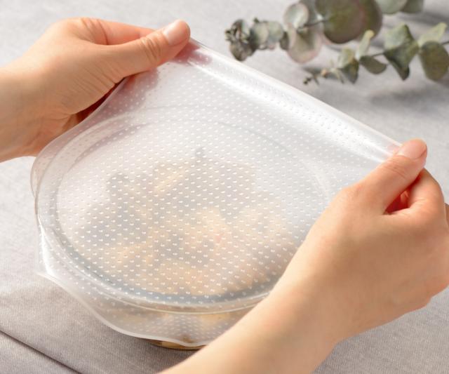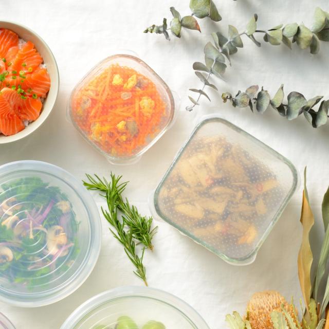 繰り返し使えるシリコーン製のラップです。お茶碗等の丸型はもちろんのこと、角型容器にも使用できます。洗って何度でも使えるので、エコで経済的です。