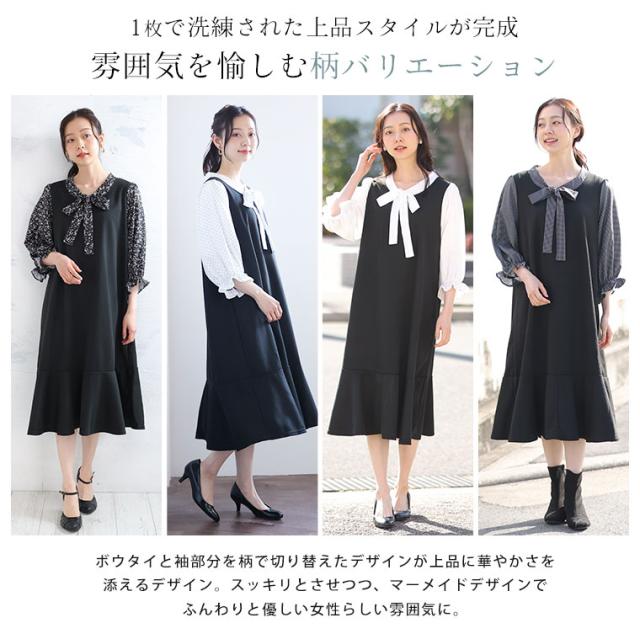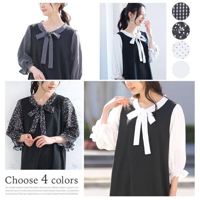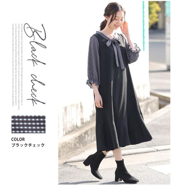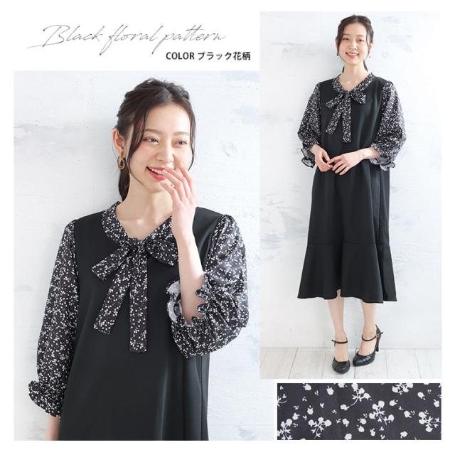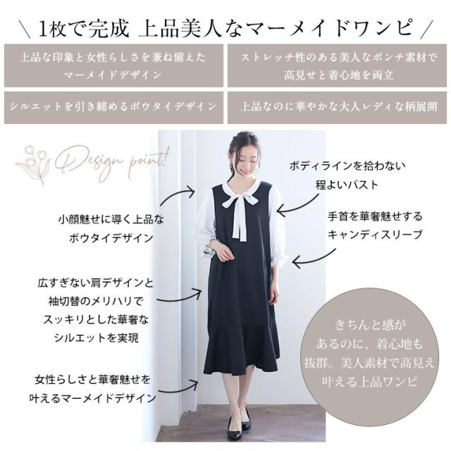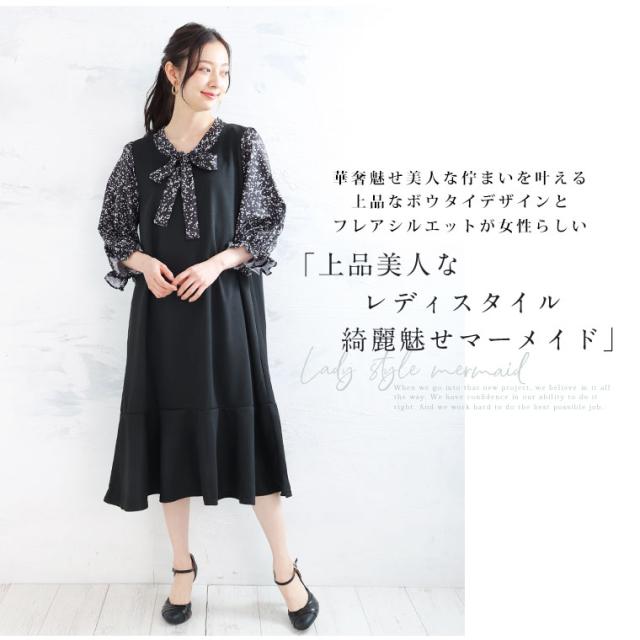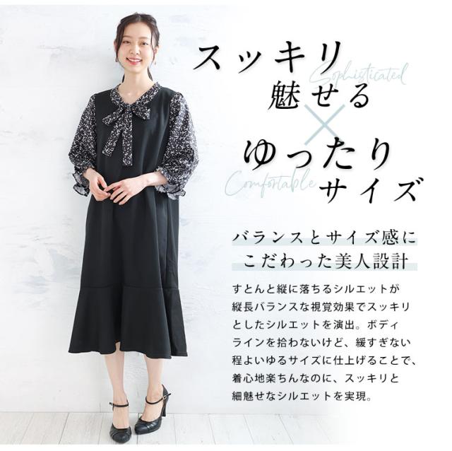 新作 大きいサイズ レディース ワンピース | Rin 袖切替え 美人 ポンチ マーメイドワンピース ボウタイ チェック 柄 ドット 花柄 [860444] LL 3L 4L 5L 6L