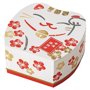 白地に赤と金の梅柄をあしらった華やかなデザインで、おすすめの縁起物の貼箱です。