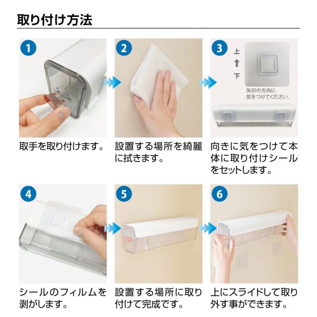 【側面でも使える汎用性】付属のシールで側面に貼り付けて簡単に設置できます。側面に設置するので空きスペース活用に最適です。