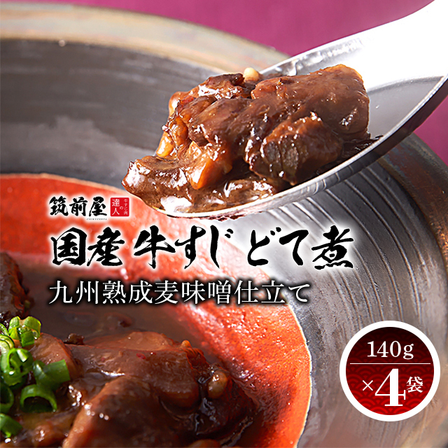 国産 牛すじ専門店 筑前屋 国産牛すじ どて煮 九州熟成麦味噌 140g×4袋 常温 牛すじ 牛スジ おつまみ レトルト ポスト投函 ビーフ