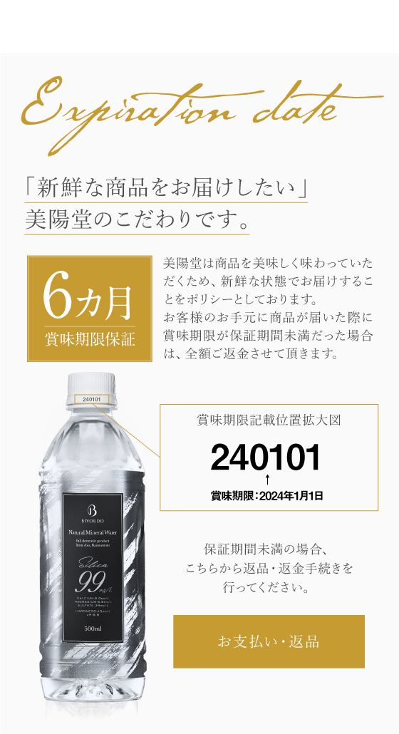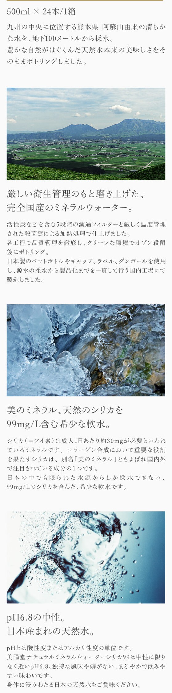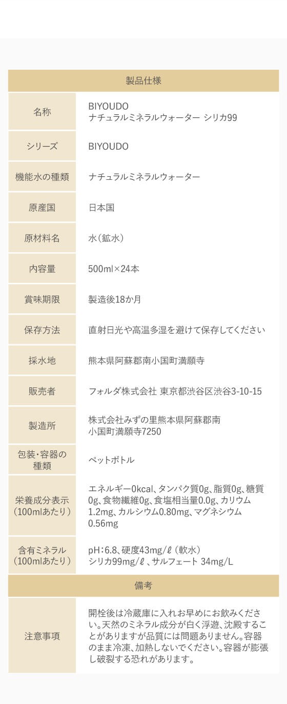 日本の中でも限られた水源からしか採水できない、美のミネラル、天然のシリカを99mg/L含んだ、希少な軟水です。