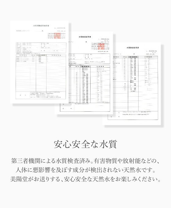 第三者機関による水質検査済み。有害物質や放射能などの、人体に悪影響を及ぼす成分が検出されない天然水です。