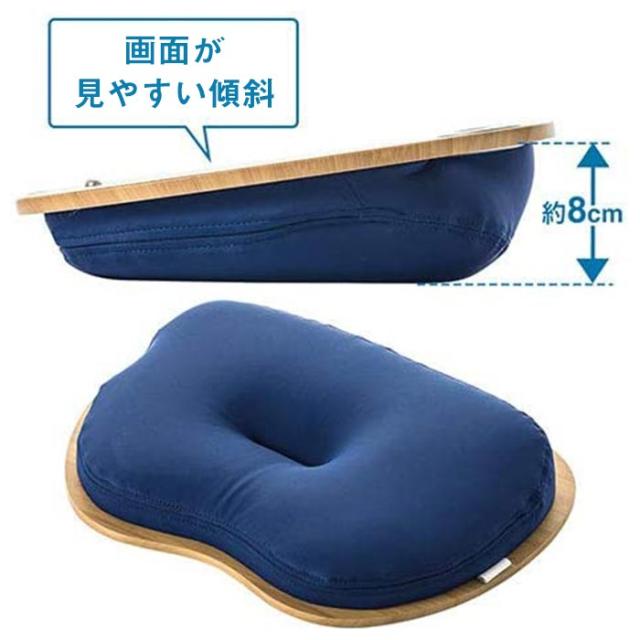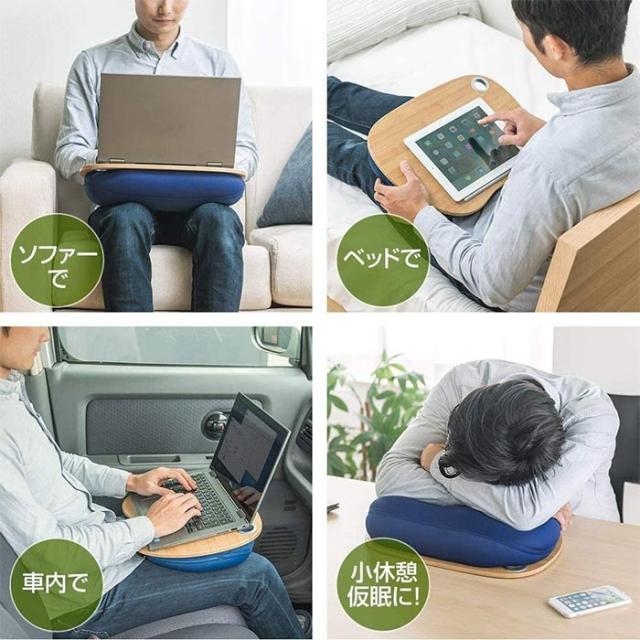 ●デスクワークとは違い、リラックスしながら操作できます。主流である14インチのノートパソコンに最適なサイズです。 裏面にクッションがついているので、ノートパソコンの重みを吸収し安定した操作が可能です。足にも優しくします。