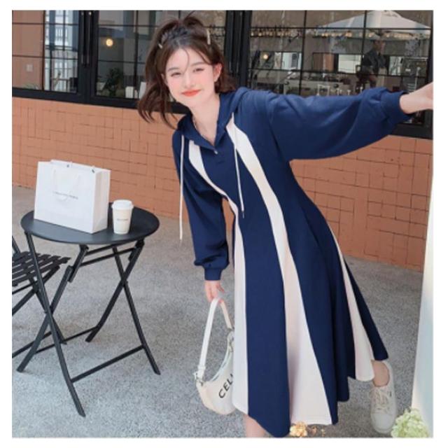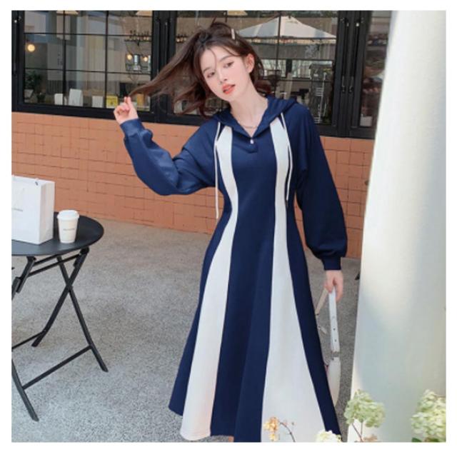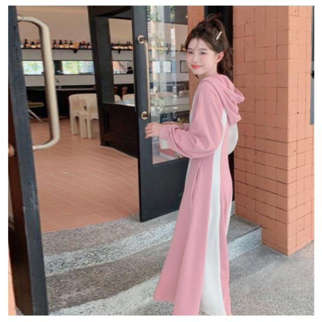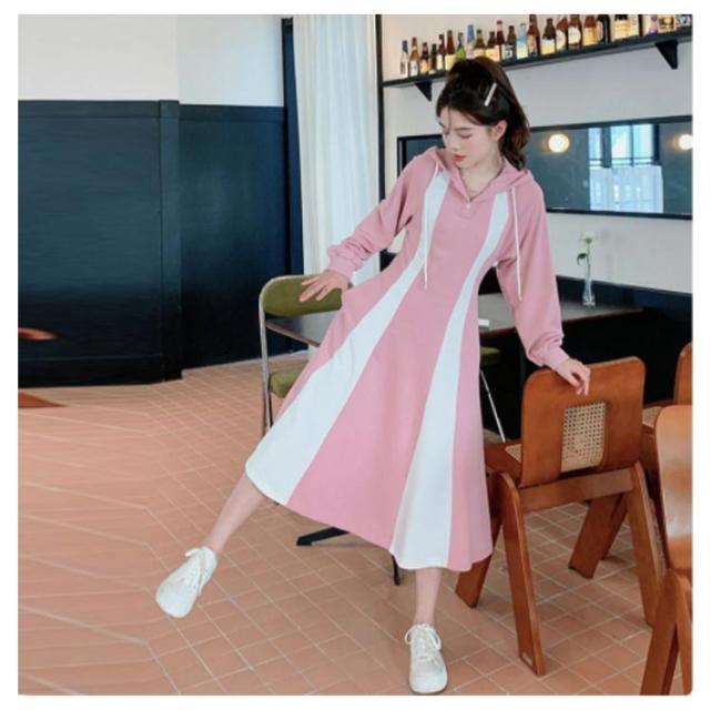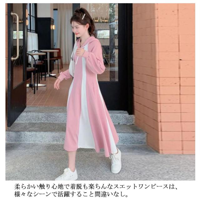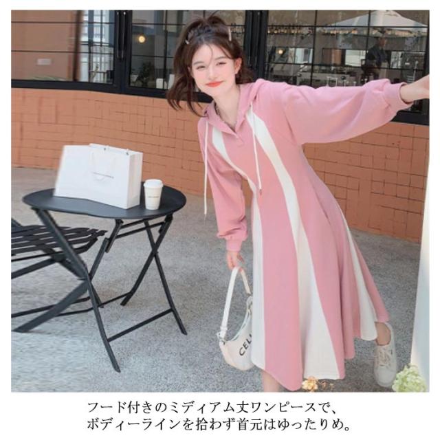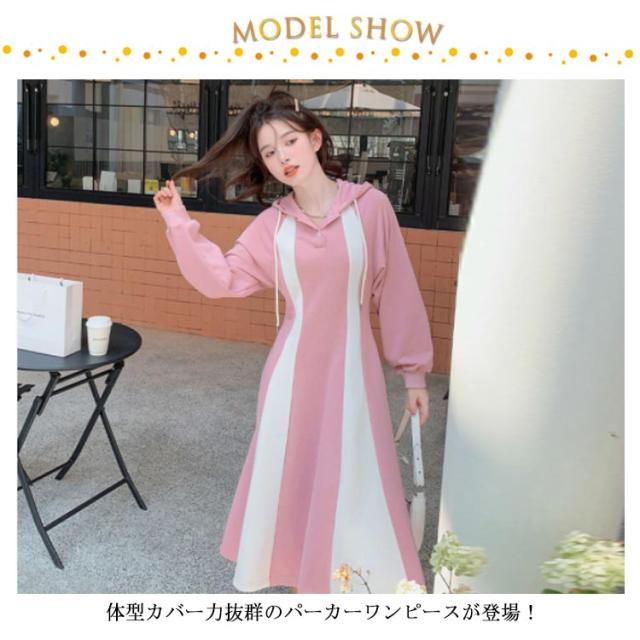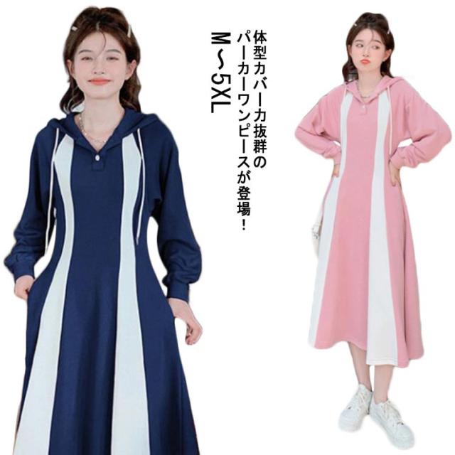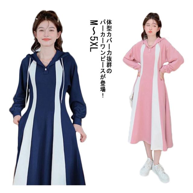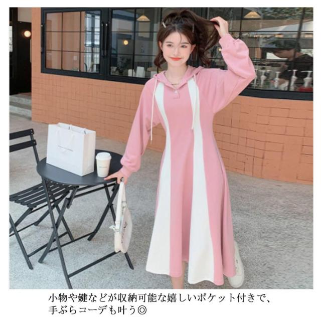 パーカーワンピース ロングワンピース クルーネックワンピース 長袖 Aライン フード付き ポケット付き レディース ピンク ネイビー パーカー ワンピース フレア 長袖 パーカー ワンピ aライン ロング丈