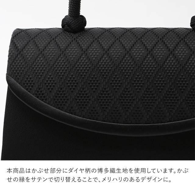 ・かぶせ部分にダイヤ柄の博多織生地を使用しています。かぶせの縁をサテンで切り替えることで、メリハリのあるデザインに。