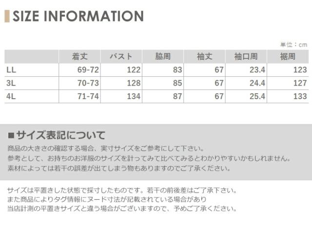 3L:着丈70-73 バスト128 脇周85 袖丈67 袖口周24.4 裾周127
