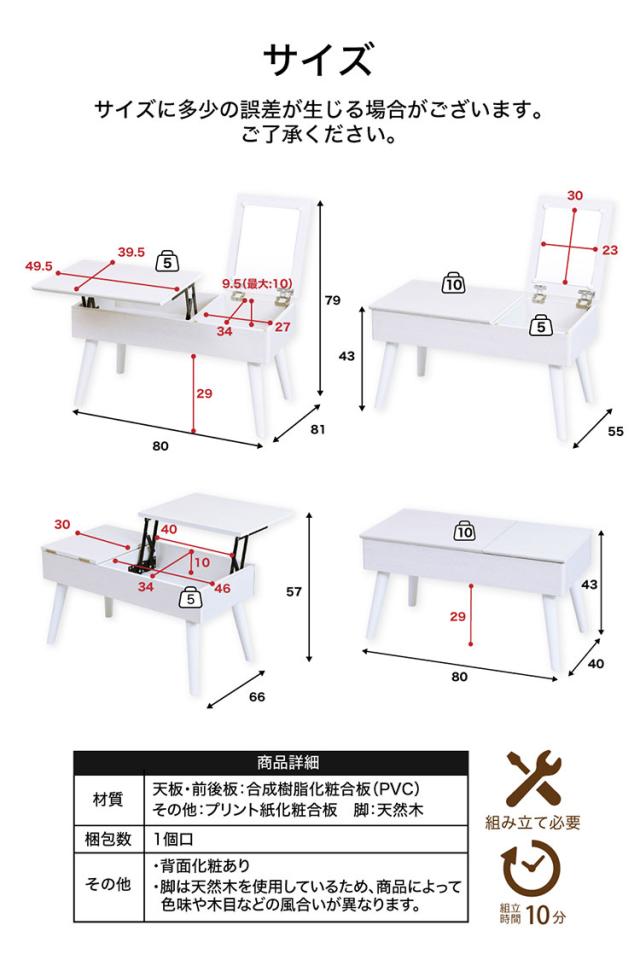 リフティングテーブル ドレッサー 昇降式 おしゃれ 半完成品 デスクドレッサー コンパクト 収納 女優ドレッサー ミラー コスメ 白 ホワイト 可愛い かわいい センターテーブル リフトアップテーブル(代引不可)【送料無料】