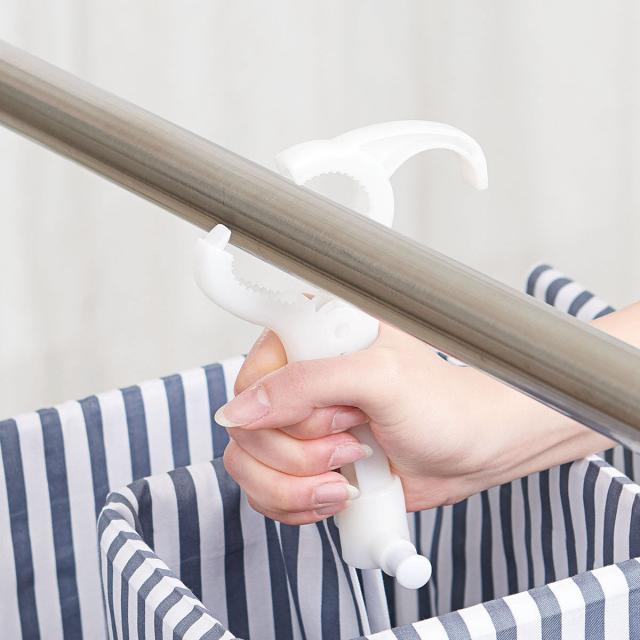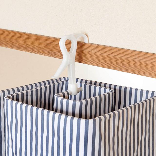 握りやすい形状のキャッチフック付きです。しっかりと竿に固定することができ、竿から落ちにくいので風が強い日の外干しでも安心です。また、ドアや鴨居に掛けられるドア枠用フックがあり、梅雨の時期や花粉が気になる時期の部屋干しにも便利です。