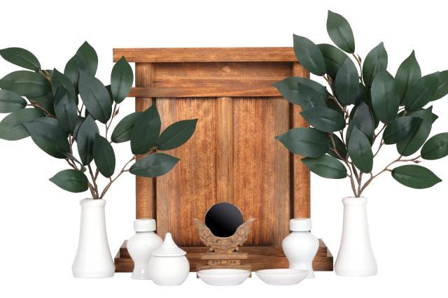 基本の「型」のまま、設置する場所を選ばない省スペースサイズとなっています。小型でもしっかりとした祖霊舎をお探しの方に、神具も付属のセットです。