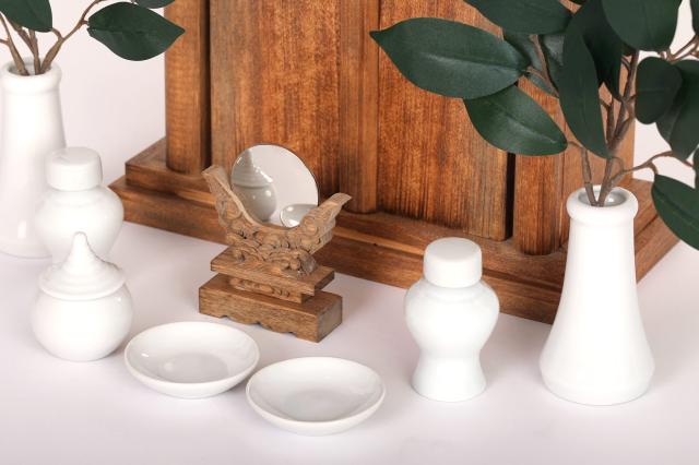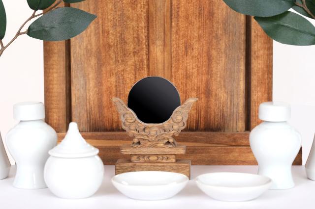 神具は基本の国産セット、滑らかな質感、瀬戸焼の陶器と彫り込み神鏡が付属します。