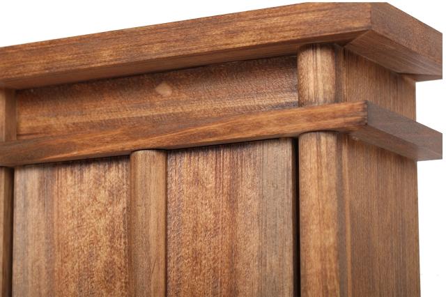 塗装は手塗りで仕上げる「家具調」の装い。独自に調合した植物系の天然樹脂塗料を使用して、木目を凛々しく表現しています。 乾燥と重ね塗り、拭き上げを繰り返し、オイルフィニッシュの風合いが十分に出るまで時間と手間を掛けた逸品。 濃く深い褐色、ウォールナット(くるみ)風となります。 |