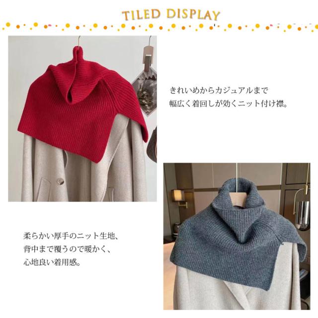 | お手持ちのトップスにINにもコートの上からさっと被ってもおしゃれ。 いつものコーデにプラスワン♪おしゃれに首元を暖めてくれます。 柔らかい厚手のニット生地、背中まで覆うので暖かく、心地良い着用感。 きれいめからカジュアルまで幅広く着回しが効くニット付け襟。 クシュッとさせてストール風に、伸ばすとベスト風にもなる頼れる一枚 春先などアウターのいらない時期に簡単に体温調節に。 | |