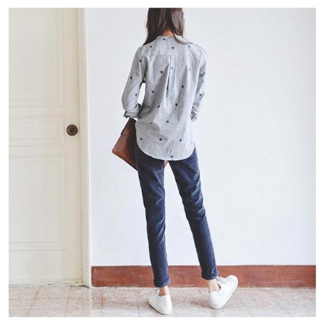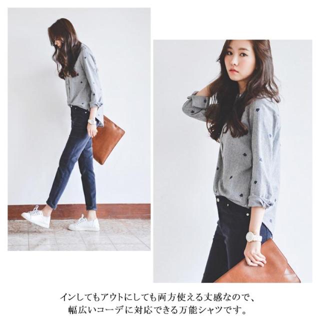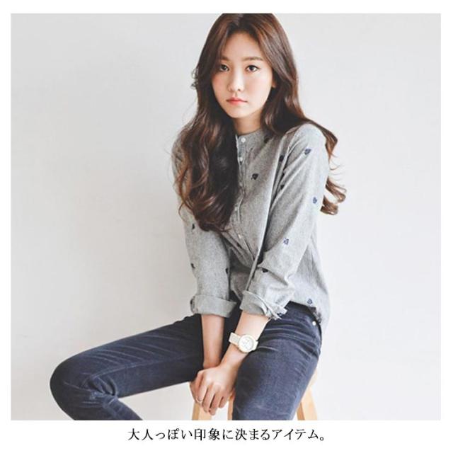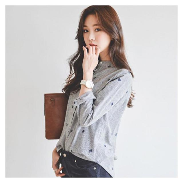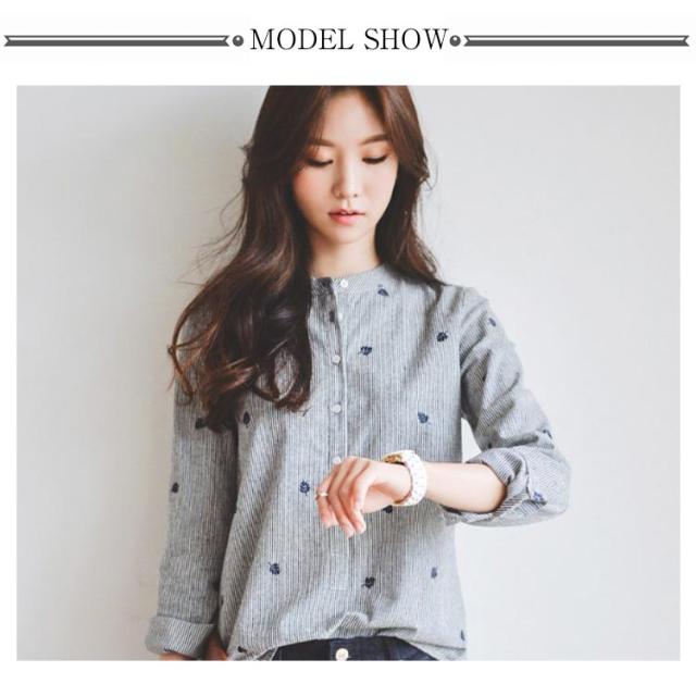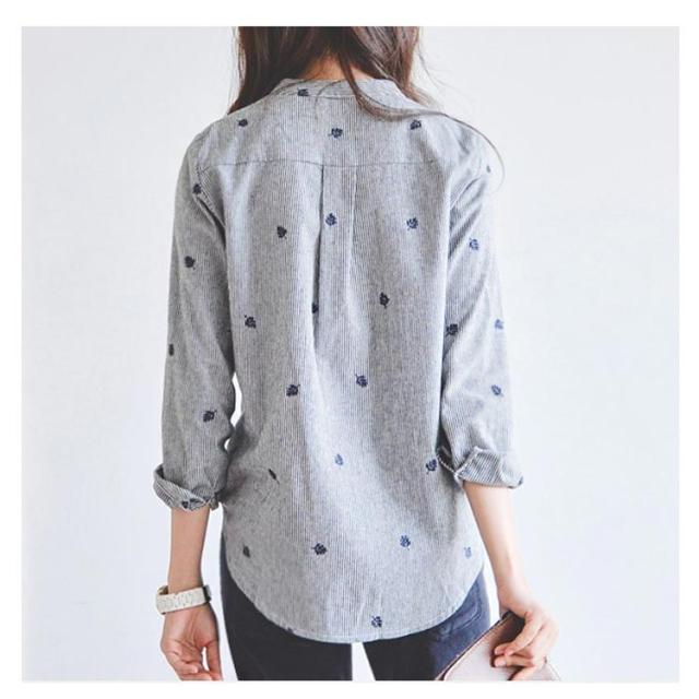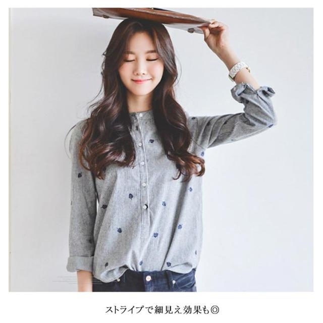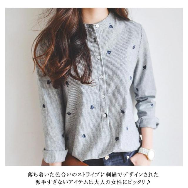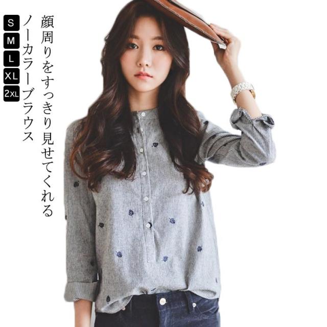 レディース 刺繍トップス ストライプシャツ 刺繍 シャツ 長袖 ノーカラー かわいい カジュアルシャツ 春 シンプル オフィス ボタン