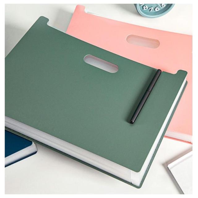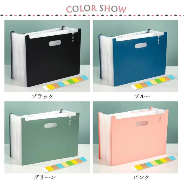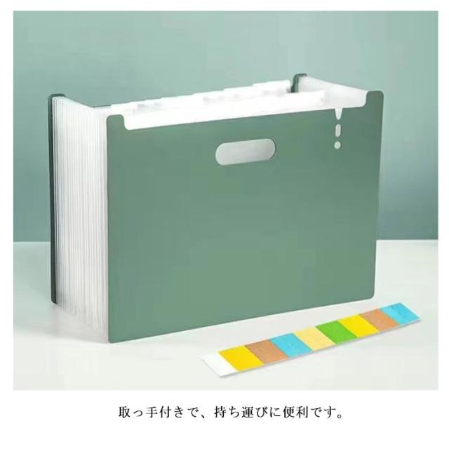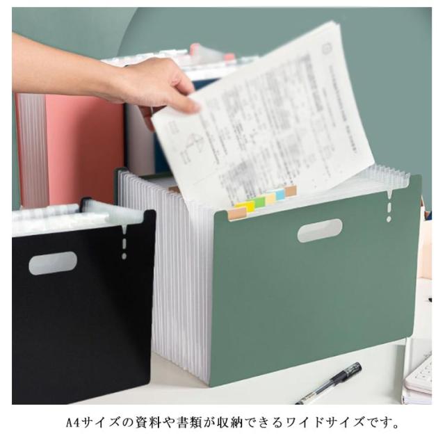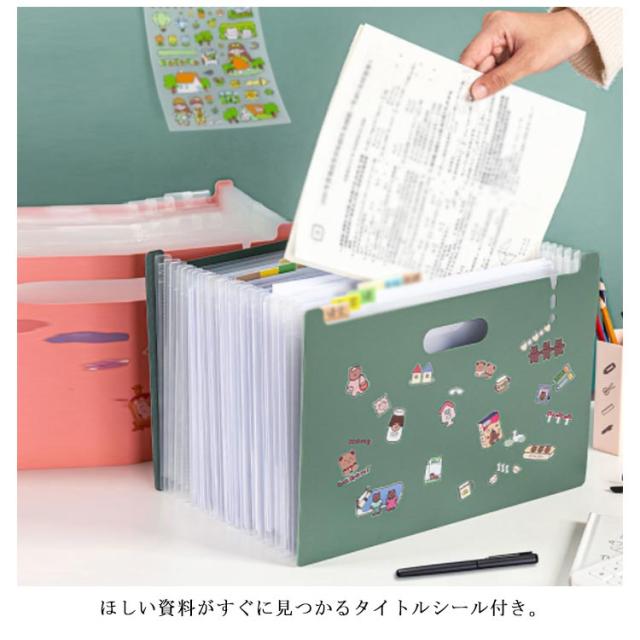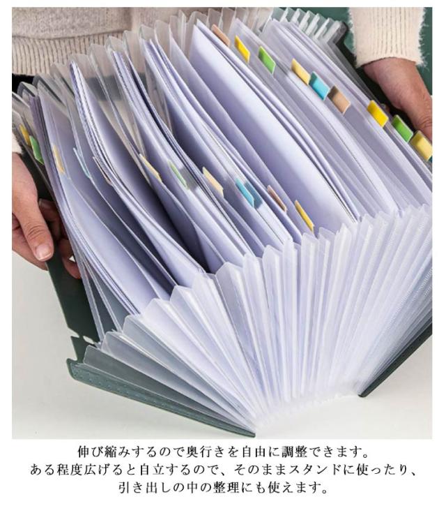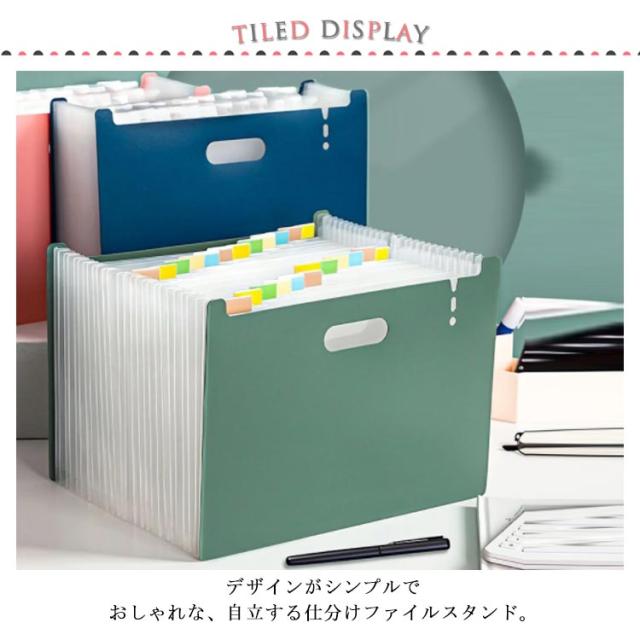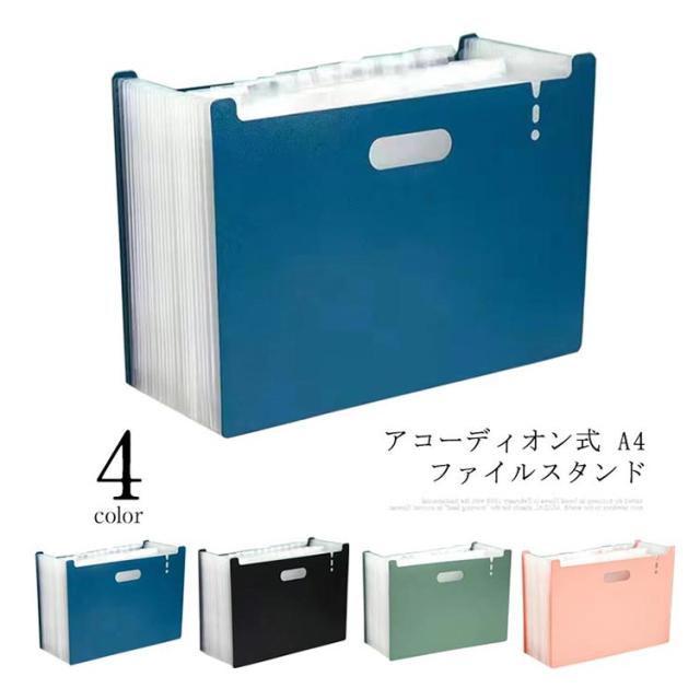 | アコーディオン式 A4 ファイルスタンド デザインがシンプルでおしゃれな、自立する仕分けファイルスタンド。 ほしい資料がすぐに見つかるタイトルシール付き。 伸び縮みするので奥行きを自由に調整できます。ある程度広げると自立するので、そのままスタンドに使ったり、引き出しの中の整理にも使えます。 A4サイズの資料や書類が収納できるワイドサイズです。 取っ手付きで、持ち運びに便利です。 ファイルの表面は水や汚れに強い丈夫なPP素材を使用。 | |