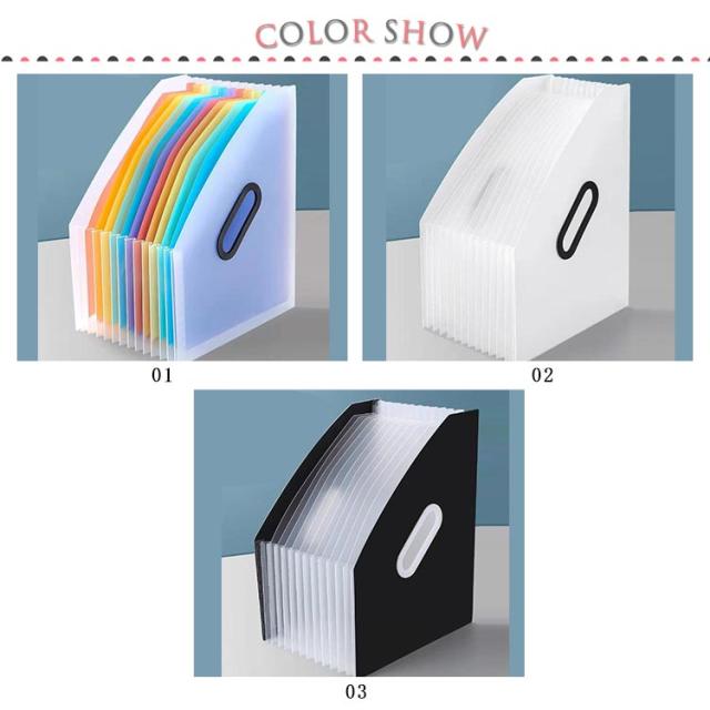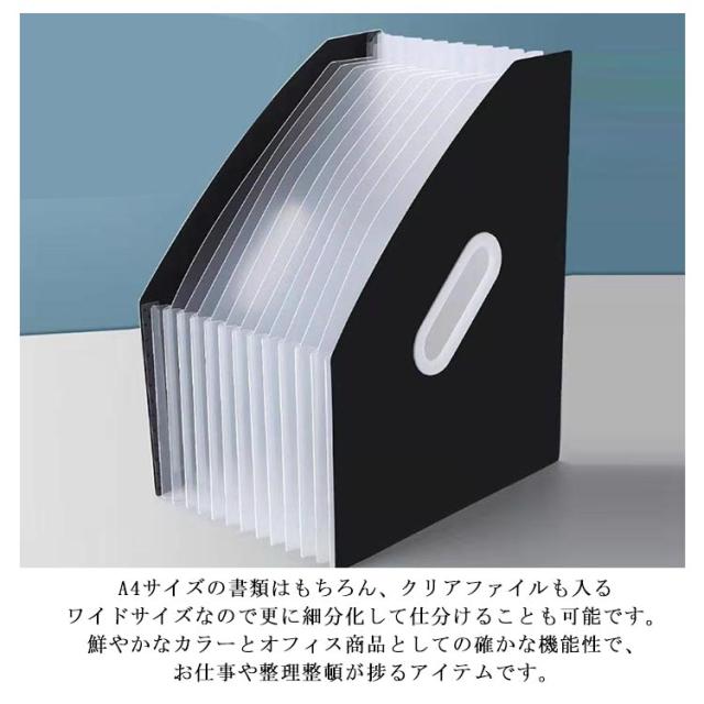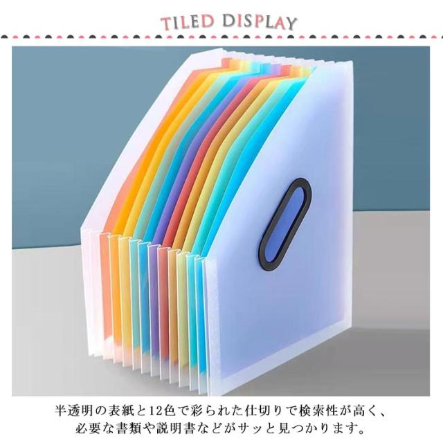 | 納品書や請求書などの伝票整理、取り扱い説明書や資料の保管などに便利なドキュメントスタンドです。 半透明の表紙と12色で彩られた仕切りで検索性が高く、必要な書類や説明書などがサッと見つかります。 設置場所や収納物の枚数に応じて伸び縮みするアコーディオン式で奥行が約2cm〜25cmの間で伸縮自在。伸ばした状態だと自立するのでそのまま机上棚のように使っても便利です。 付属のタイトルシールを張り付けて分類ごとに仕分ければ検索性がアップ。ラベルプリンターで印刷したものなどを用いるのもオススメ。 A4サイズの書類はもちろん、クリアファイルも入るワイドサイズなので更に細分化して仕分けることも可能です。 鮮やかなカラーとオフィス商品としての確かな機能性で、お仕事や整理整頓が捗るアイテムです。 | |