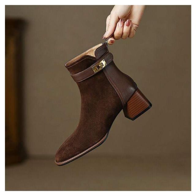 | シンプルでスッキリしたシルエットに高級感をプラスしたデザイン。 ゴールド金具付きで上品カジュアルに! バックジップ付きなので簡単な着脱のしやすさや、チャンキーヒールで安定感があるため長時間の歩行でも疲れにくいなど機能面も見どころです。 ショート丈のシルエットはフルレングスのパンツやスカートと合わせたコーディネートにピッタリ。 ちょっと大人なスタイルを実現してくれるオススメアイテムです。 | |
