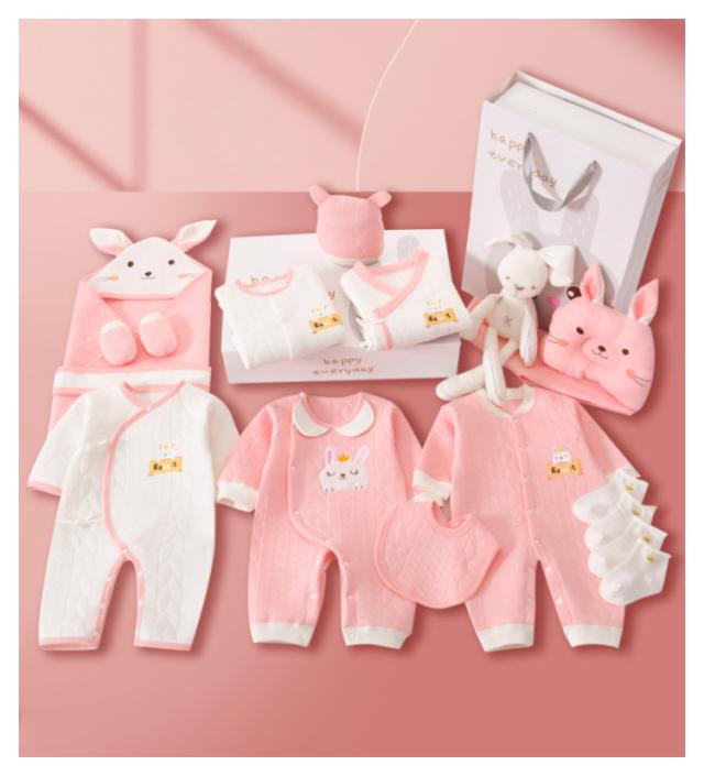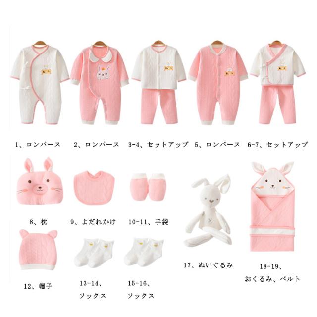 | サイズについての説明 | 【セット内容】 1、ロンパース 2、ロンパース 3-4、セットアップ 5、ロンパース 6-7、セットアップ 8、枕 9、よだれかけ 10-11、手袋 12、帽子 13-14、ソックス 15-16、ソックス 17、ぬいぐるみ 18-19、おくるみ、ベルト |
