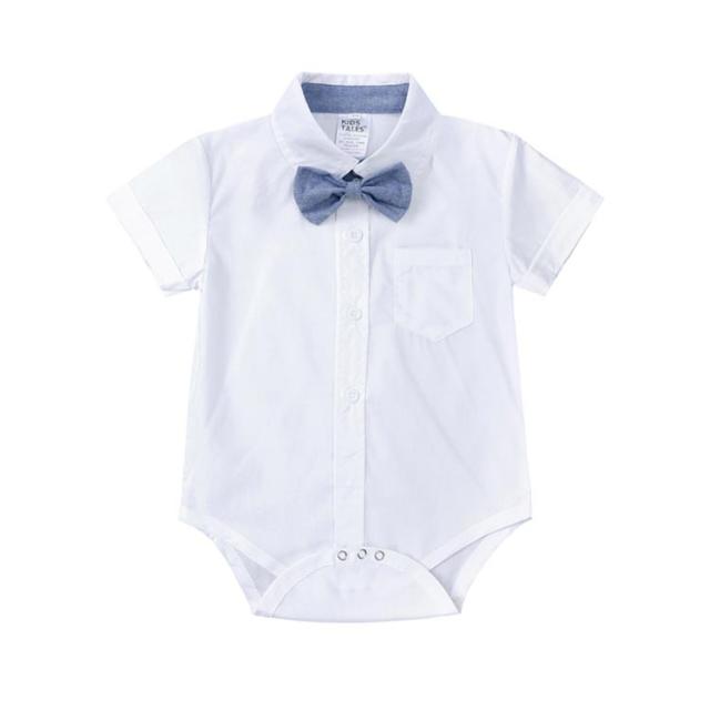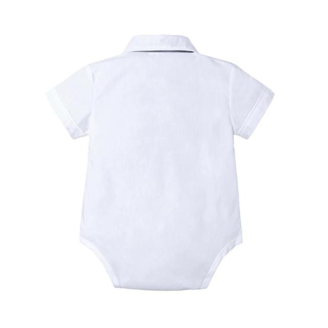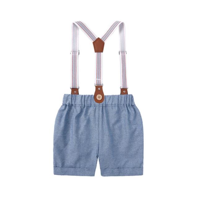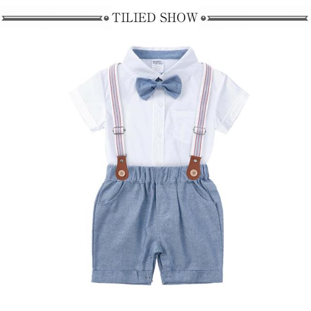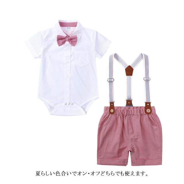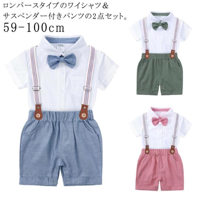 フォーマルスーツ ロンパース ベビー服 2点セット フォーマルスーツ 出産祝い 男の子 ベビースーツ 上下セット 蝶ネクタイ付き 半袖シャツ+サスペンダー付きパンツ 入園式 七五三 発表会 結婚式 半ズボン 初節句 夏 赤ちゃん