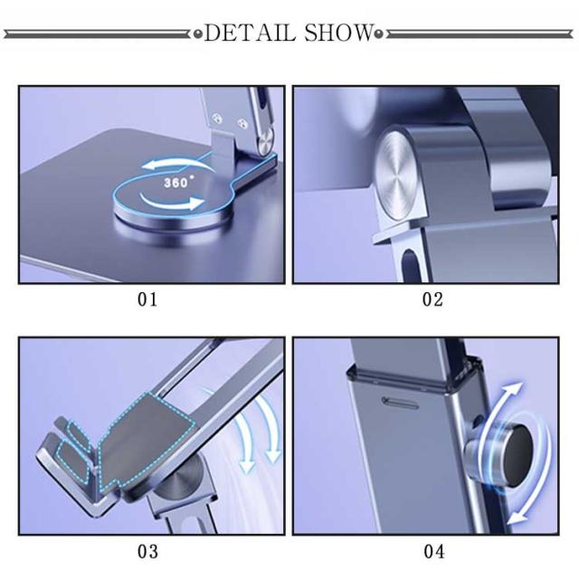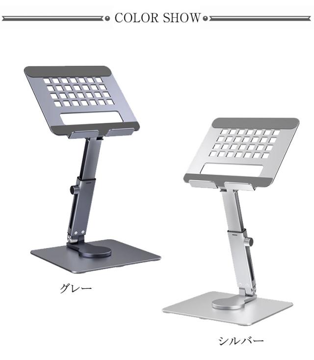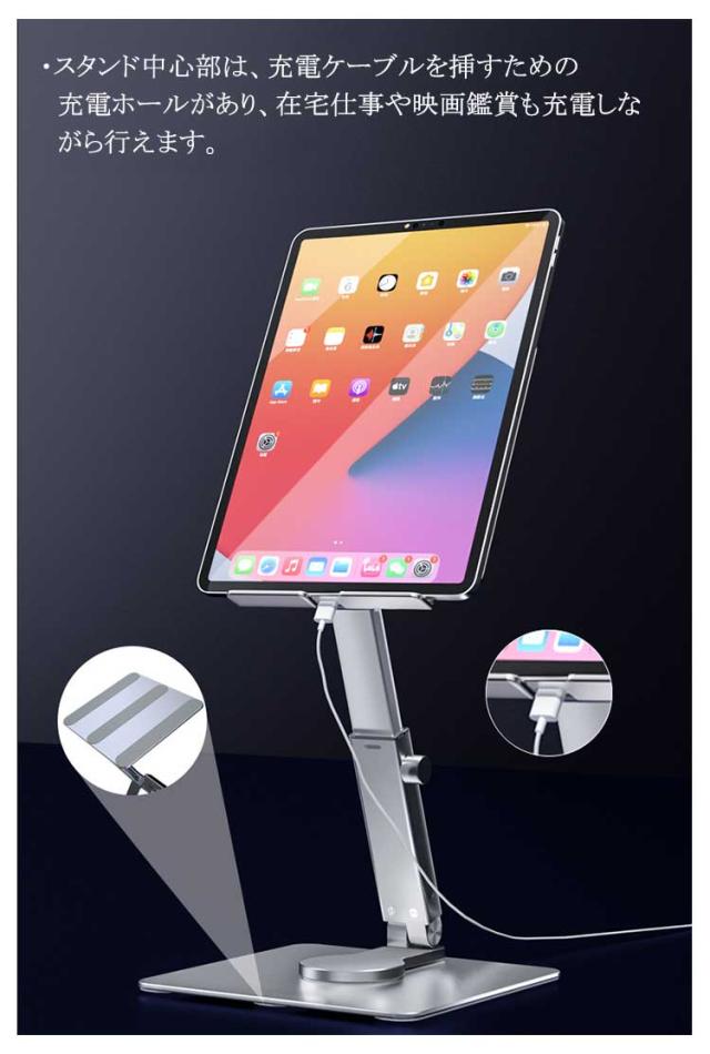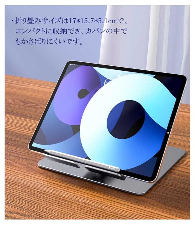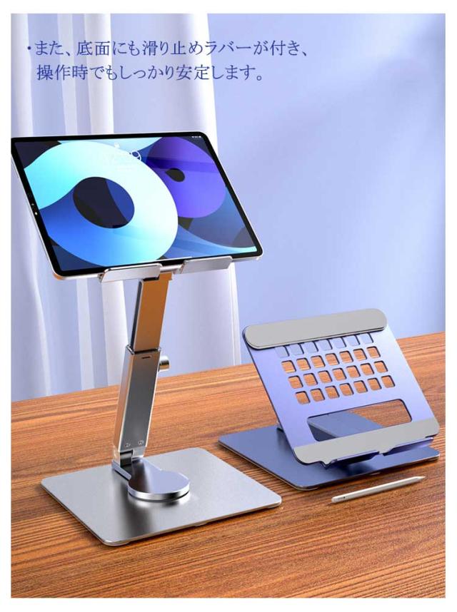 タブレットスタンド iPadスタンド ポータブル iPadProスタンド 安定 タブレット専用スタンド 折りたたみ 高さ調整 角度調整可能 360度回転 持ち運び便利 アルミ合金 360回転 伸縮 放熱 シリコン製固定パッド テレワーク オフィス ビジネス 簡単収納