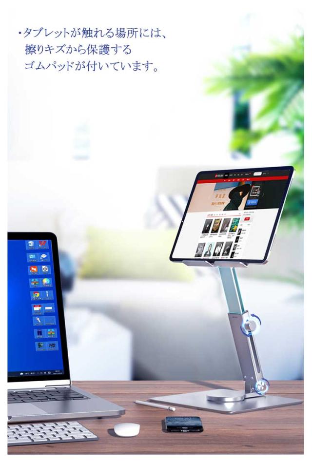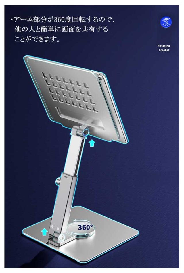 | ・タブレット用伸縮アームタイプアルミスタンド ・伸縮アームと2つのヒンジにより無段階で高さと角度が調整できる、折りたたみにも対応したアルミ製のタブレット用スタンド。 ・シンプルながら高級感あるデザイン。 ・折り畳みサイズは17*15.7*5.1cmで、コンパクトに収納でき、カバンの中でもかさばりにくいです。 ・アーム部分が360度回転するので、他の人と簡単に画面を共有することができます。 ・タブレットが触れる場所には、擦りキズから保護するゴムパッドが付いています。 ・また、底面にも滑り止めラバーが付き、操作時でもしっかり安定します。 ・タブレットの熱がこもりにくいように多数の放熱穴が開いています。 ・タブレットは、縦置き・横置きどちらにも対応。 ・スタンド中心部は、充電ケーブルを挿すための充電ホールがあり、在宅仕事や映画鑑賞も充電しながら行えます。 | |