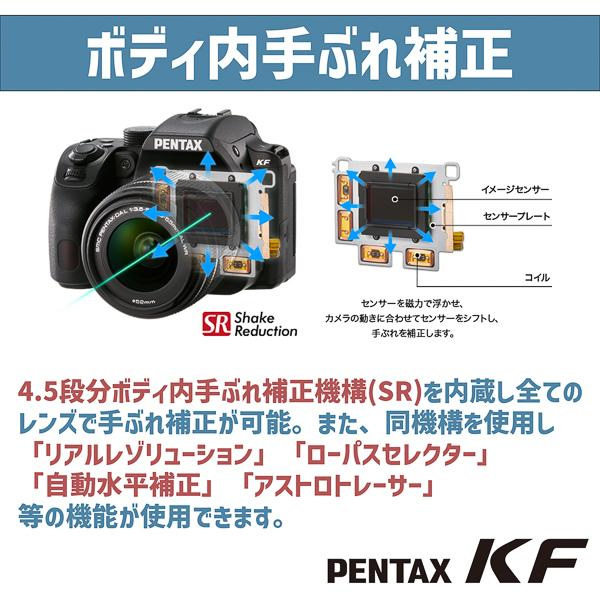 ※ボディのみ アウトドア撮影に適した防塵・防滴の小型ボディに本格的な光学ファインダーをはじめとする、こだわりの基本性能を備えたスタンダードクラスのデジタル一眼レフカメラ「PENTAX KF」 ■外形寸法 約125.5mm(幅)×93.0mm(高)×74.0mm(厚) (突起部を除く) ■質量 約684g (バッテリー、SDカードを含む) 約625g (本体のみ) ■付属品 ストラップ O-ST132 充電式リチウムイオンバッテリー D-LI109 充電器D-BC186 USB電源アダプター 電源プラグ USBケーブル I-USB166 ソフトウエア(CD-ROM)S-SW186 スタートガイド 【これ以降はカメラに装着状態で出荷】 アイカップFR ホットシューカバーFK ボディマウントカバー ※記載は商品仕様の一部です。詳細はメーカーHPをご覧ください。 ※仕様説明不足等の理由での返品はできません。特に適合等は必ずご確認ください。