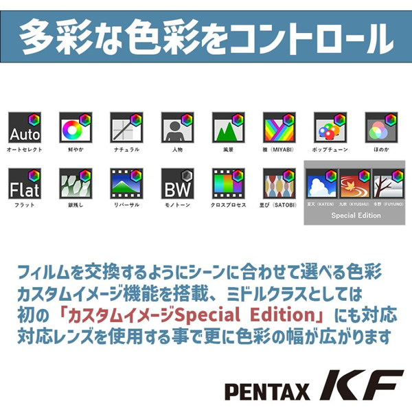 アウトドア撮影に適した防塵・防滴の小型ボディに本格的な光学ファインダーをはじめとする、こだわりの基本性能を備えたスタンダードクラスのデジタル一眼レフカメラ「PENTAX KF」