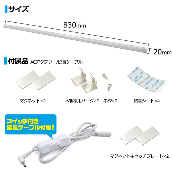 ワンタッチ取付! 83cm LEDバーライト 電球色 白色 90cm棚用 ライティングバー LEDライト 間接照明 押入れ等 マグネットでスチール棚等に取付 スイッチケーブル付き ディスプレイ照明 ライト 電気 飾り用 足元照明 店舗什器 照明器具