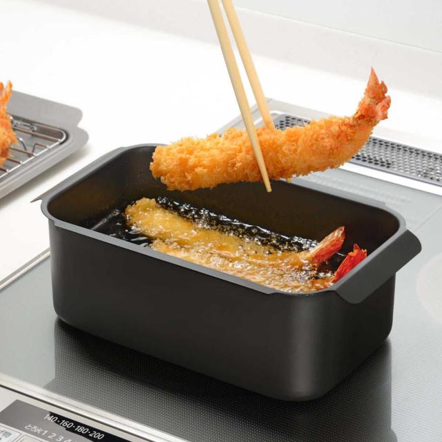 少ない油で揚げられるコンパクトな角型の揚げ鍋です。サッと取り出せてパッと使えるサイズなので、毎朝のお弁当作りや少量の揚げ物も手軽にできます。