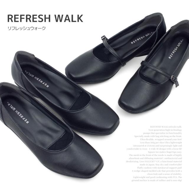 REFRESH WALK [リフレッシュウォーク]機能性にも特化した次世代ハイテクノロジーパンプス。安定感のあるコンフォート超快適フォーマルパンプス。超屈曲!超軽量!足を圧迫させない特別製法で超快適な履き心地!3Eの幅広設計で外反母趾の方も安心してお履き頂けます。高さ約4.0cmのウェッジソールで安定感抜群で歩きやすいソールです。ヒールが苦手な方にもおすすめのパンプスです!足の疲れを軽減する、ふわふわ立体クッションの機能性インソールで疲れにくい!選べる2デザイン