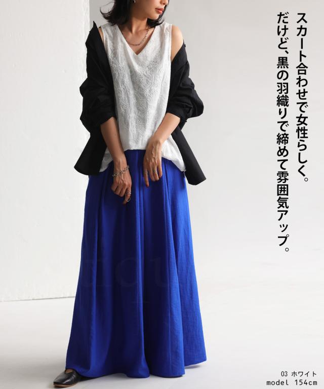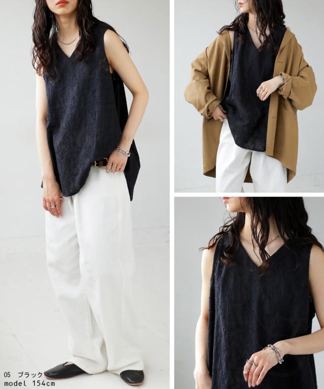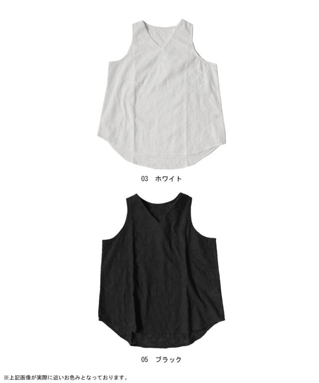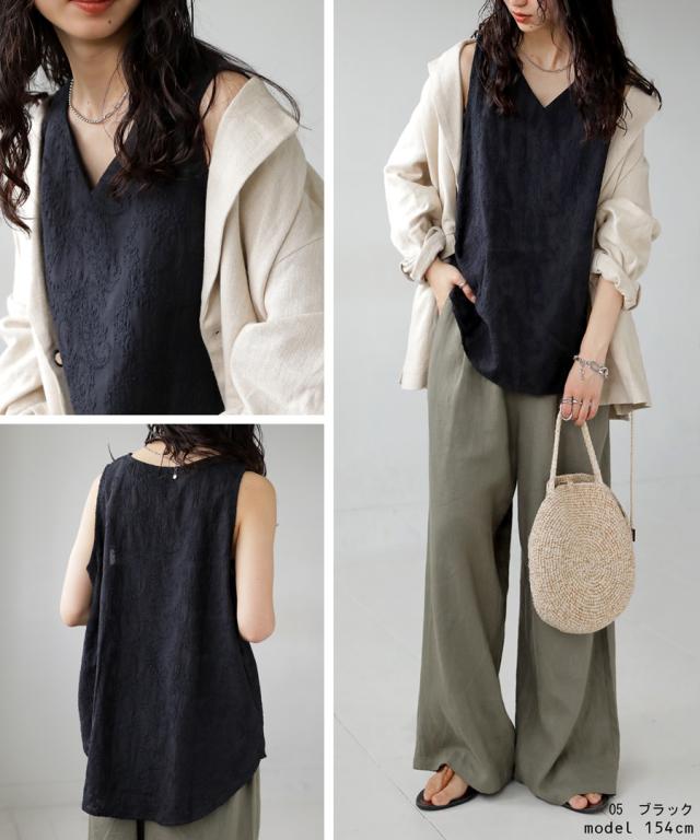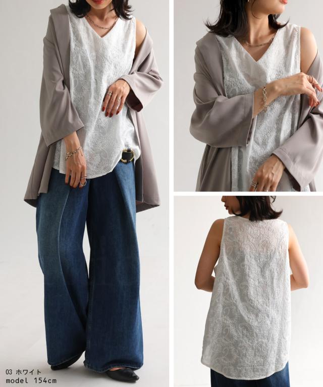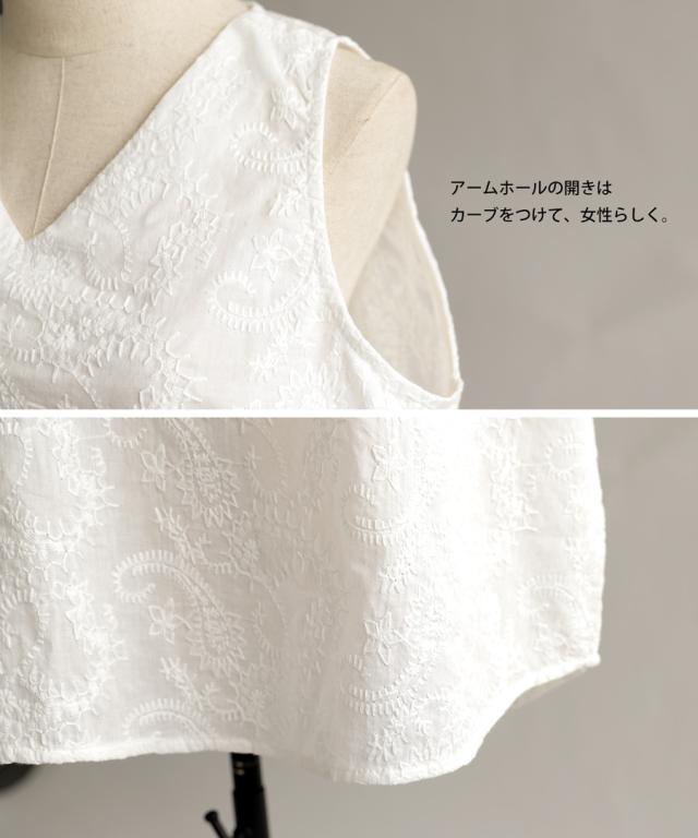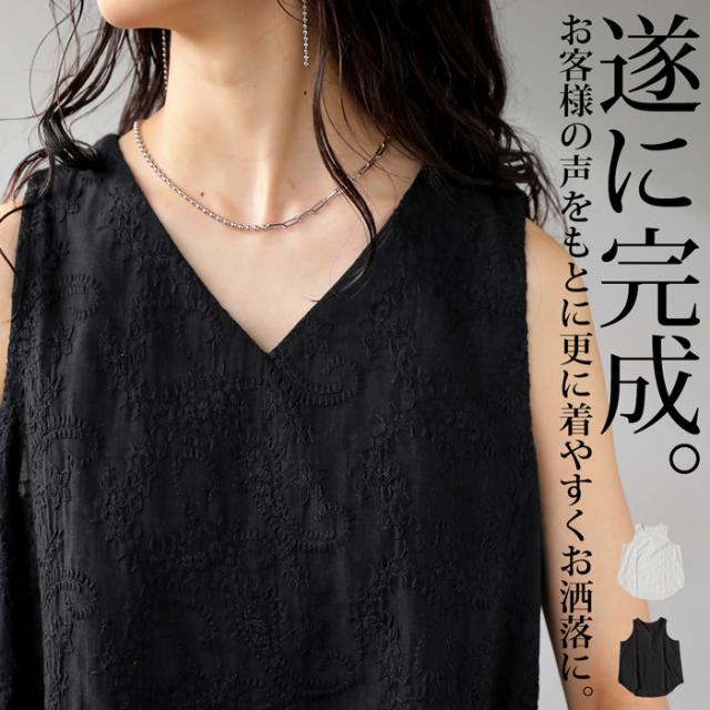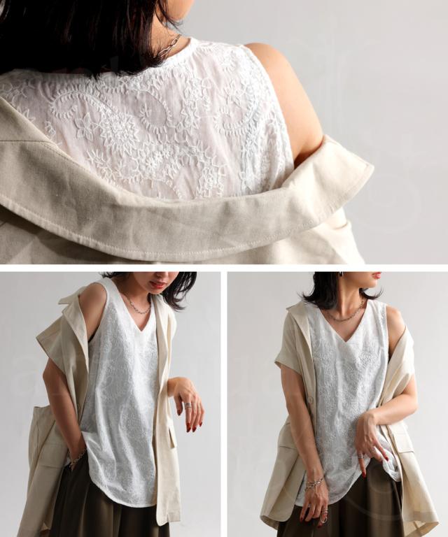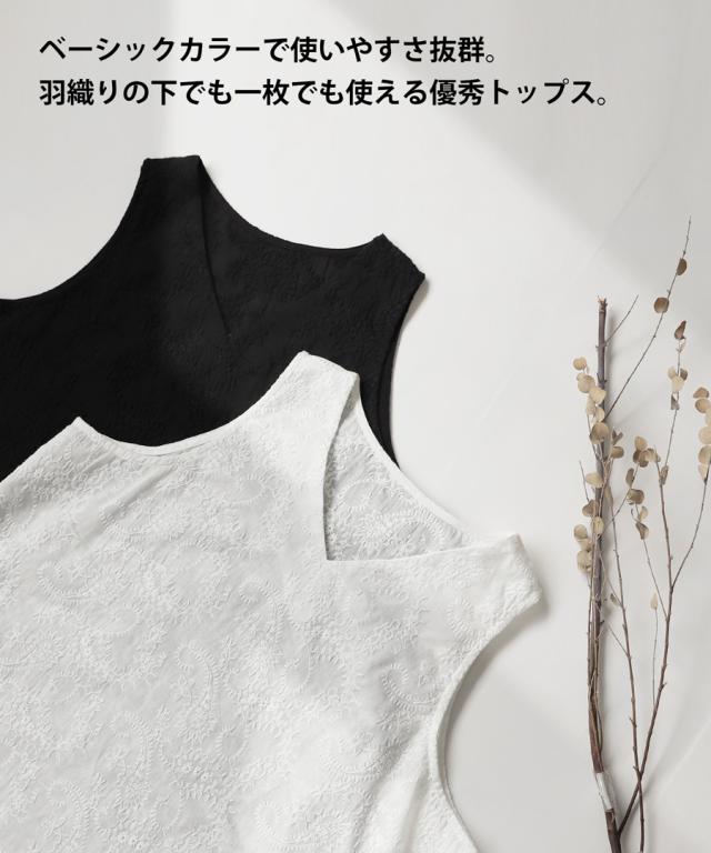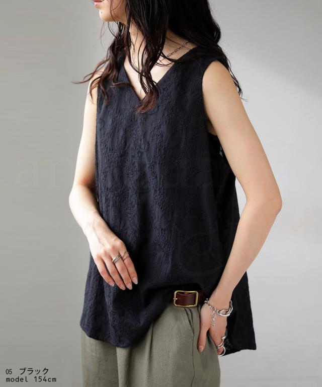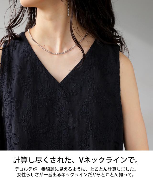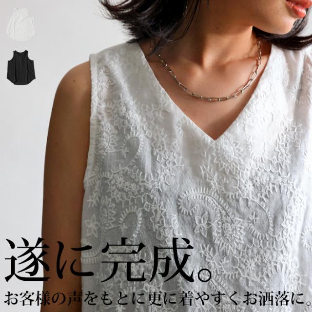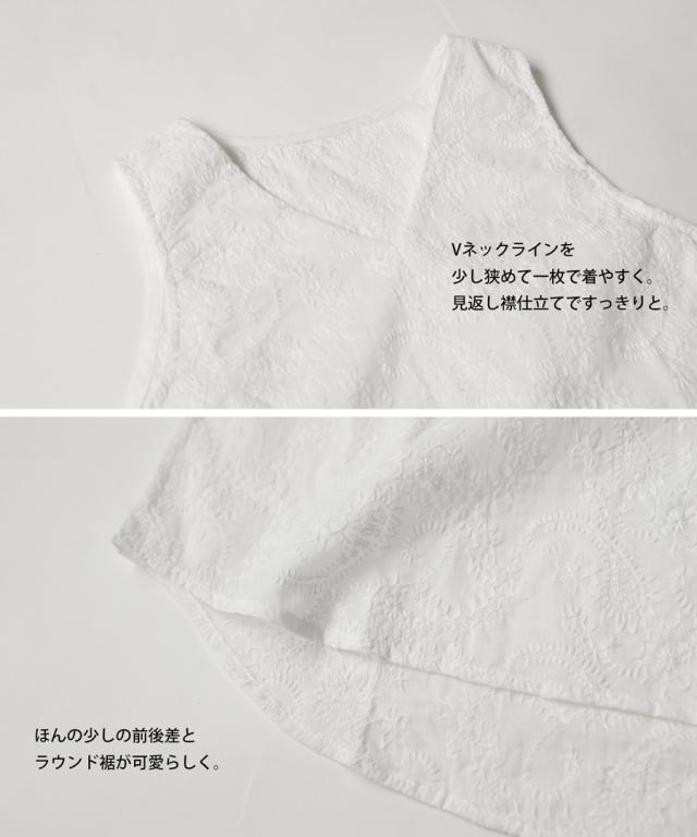 ya-00434 綿100 タンク ノースリーブ 刺繍 Vネック シンプル 上品 きれいめ ゆったり ロング 長め丈 前後差 ラウンド裾 インナー レイヤード 重ね着 綿 コットン 総柄