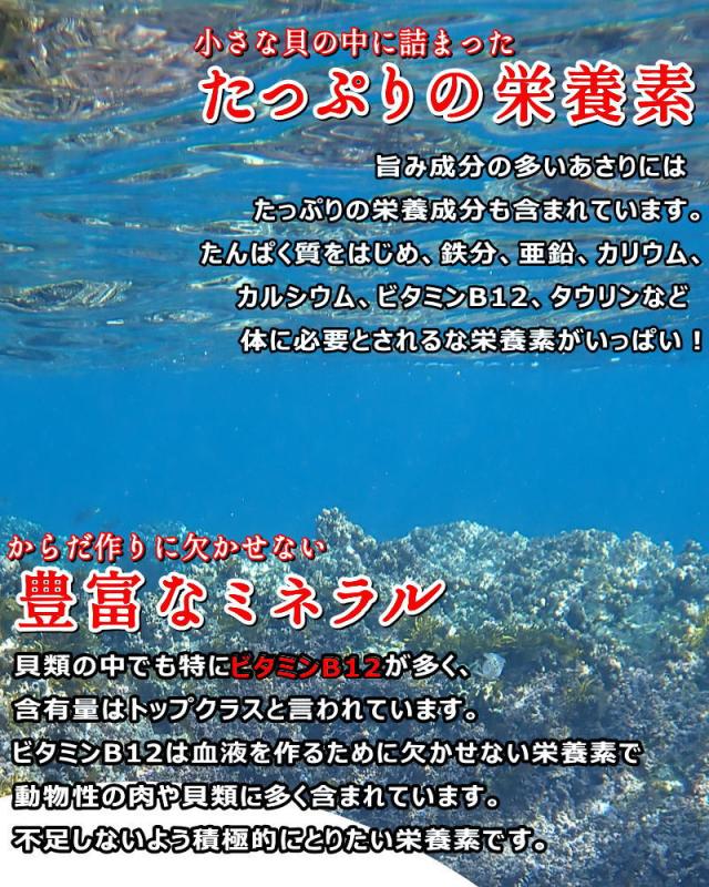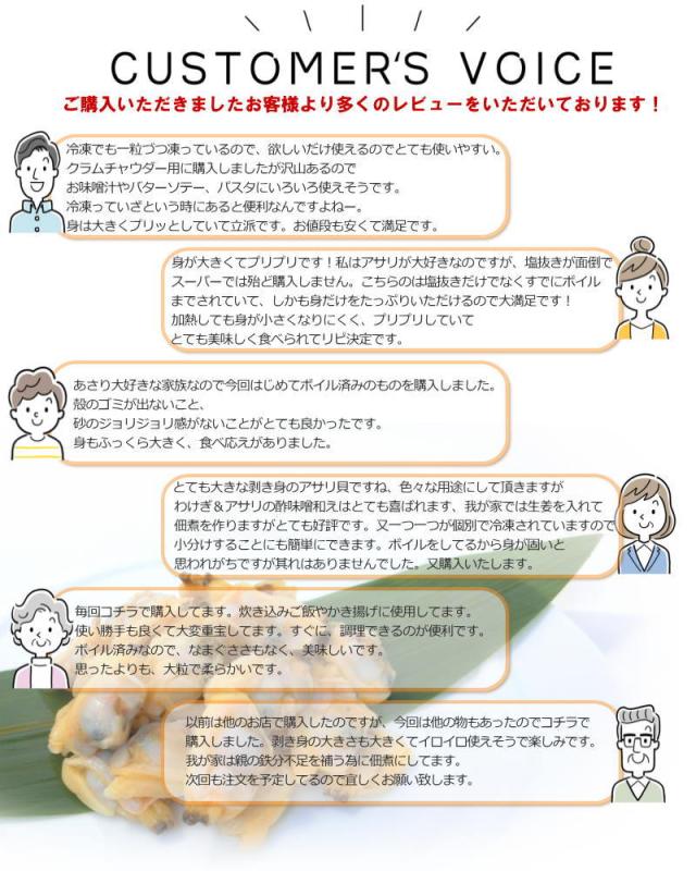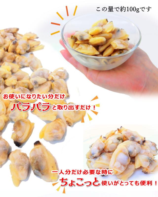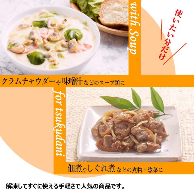 加熱で固くなりにくく、あさりの美味しい旨みも詰まっています。 良い出汁が出ますので、スープや汁物に最適です。