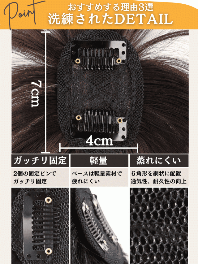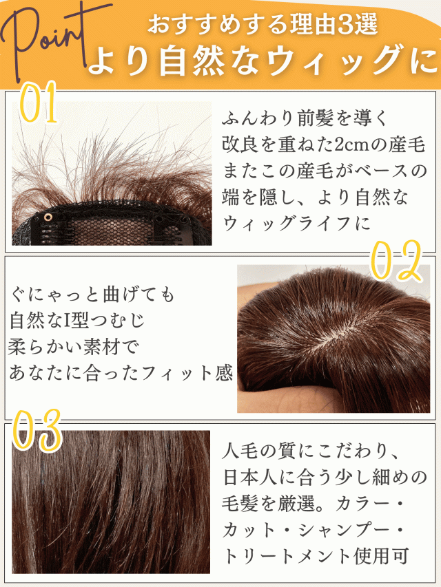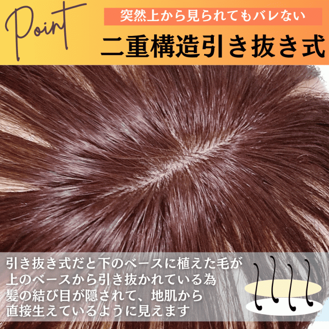 | 特徴2 | 植毛方法にもこだわり、二重構造&引き抜き式を採用。ナチュラルなI型つむじを実現 |