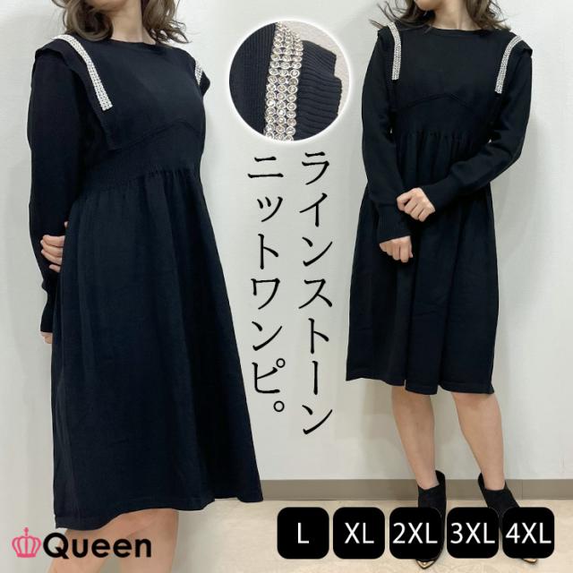 大きいサイズ レディース ニットワンピース エンパイアワンピ 黒 ウイングショルダー 春 秋冬 L LL 3L 4L 5L (314175)