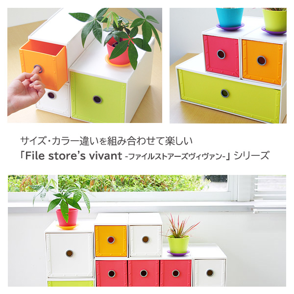 サイズ・カラー違いを組み合わせて使うことを考えたモジュール設計が特徴の「File store’s vivant-ファイルストアーズヴィヴァン」シリーズの収納ボックス。