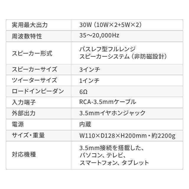 ●木製キャビネットで箱鳴りを抑えながら迫力のある重低音の再現が可能な2chスピーカーです。●メインスピーカー10W×2、ツイーター出力5W×2の最大出力30Wのハイパワースピーカーです。