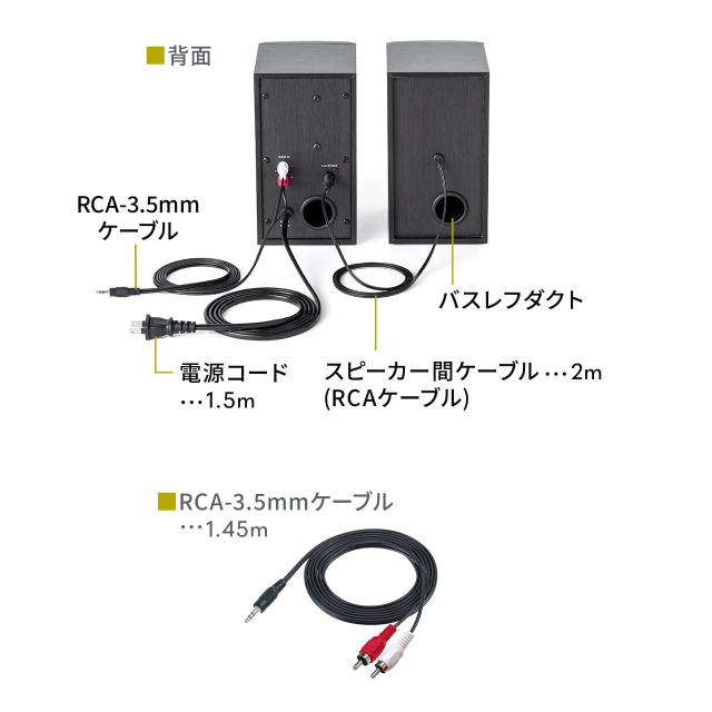 ■ケーブル長:RCA-3.5mmケーブル約1.45m 、スピーカー間ケーブル約1.3m、電源コード約1.5m