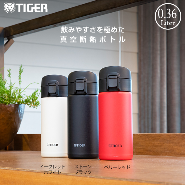 - 前回、職場用の600ml入りのマグタイプの水筒を購入しました。 今回は、休日の外出用に手持ちのバックに立てて入るサイズの360ml入りを購入しました。 外出時は蓋を外すのが面倒なので、ワンプッシュタイプを購入しました。 今迄使っていたワンプッシュタイプの水筒は蓋のパッキンが鼻に当たりましたが、この製品は蓋が大きく開くので、パッキンに鼻が当たりません。 大変気に入りました。 品質に関しては前の商品と同様にタイガーさんですので安心です。これから愛用させて頂きます。