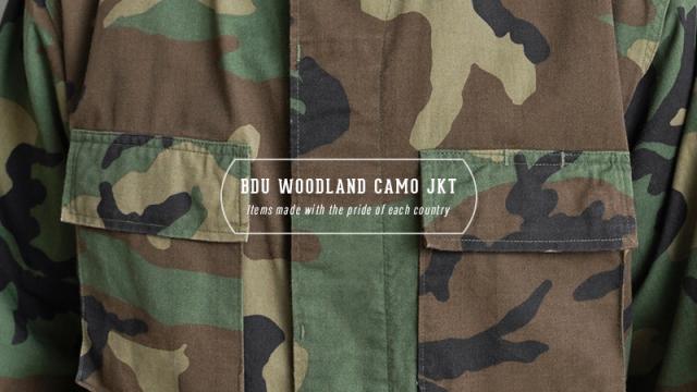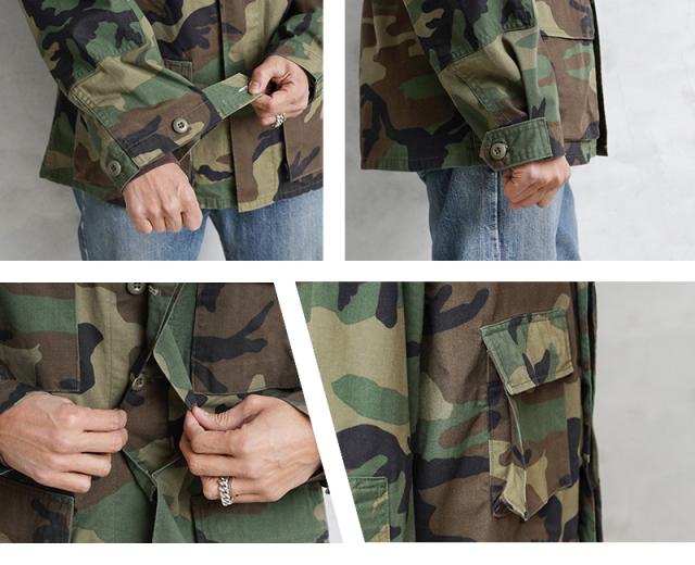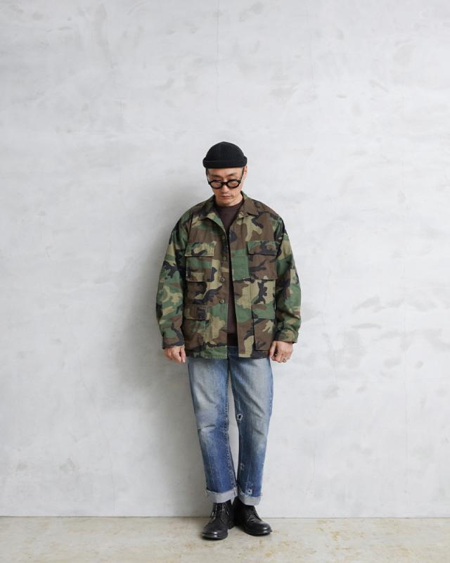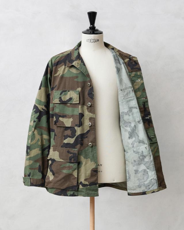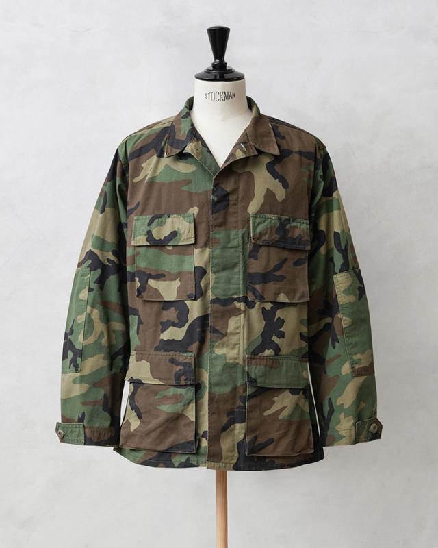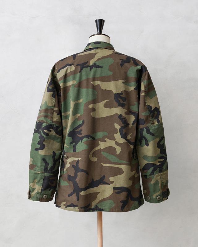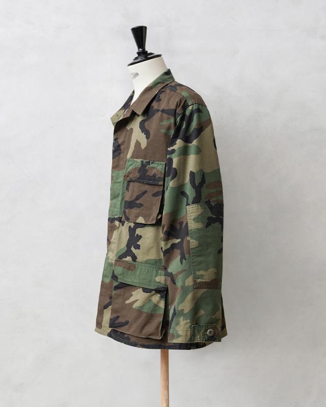 1981年より約30年以上にわたり全米軍で使用され、米海兵隊では2005年、米陸軍では2008年、米空軍では2011年、米海軍では2012年まで使用されたウッドランドカモ柄のBDU(野戦服)です。その後もアメリカ陸軍特殊部隊のグリーンベレーではウッドランドのBDUジャケットが限定で継続使用されていました。こちらの中期型の特徴としては、1984年頃から1995年頃まで生産されたモデルで、胸ポケットのマチが外側に設けられており、襟の形状が中期型以降は小さくなり、袖口の調節用タブは前期、中期、後期になるにつれて幅広で短い形状へと変更されました。中期型にのみウエスト部分に調節用のアジャスターが付属しています。BDUとは「Battle Dress Uniform」の略で、戦闘服のことであり、BDUジャケットの特徴とも言える4つのフロントポケットは2重構造のフラップがついており、ボタンが外に露出しない仕様です。4箇所のポケットはマチ付きで立体的なデザインになっています。