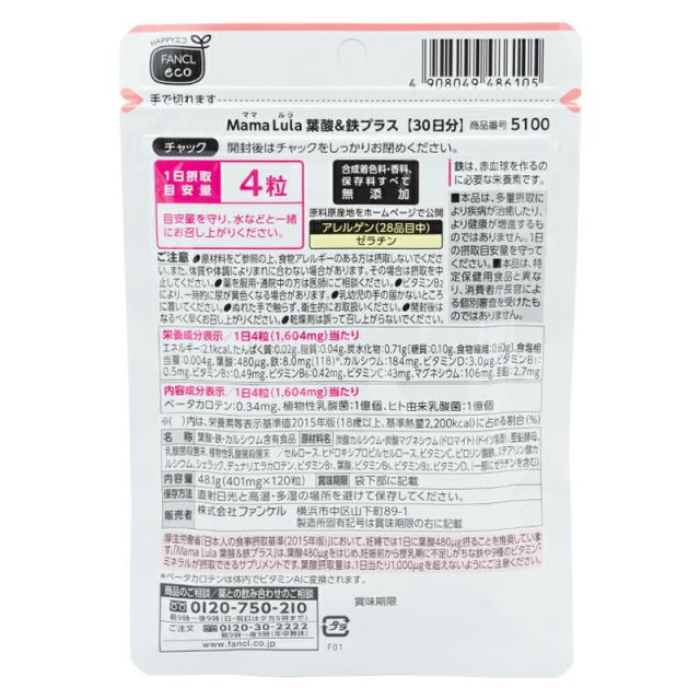 FANCL ファンケル Mama Lula (ママルラ) 葉酸&鉄プラス<栄養機能食品> 30日分 葉酸サプリ 妊婦 鉄分 カルシウム ビタミン 亜鉛 [ギフトラッピング対応]