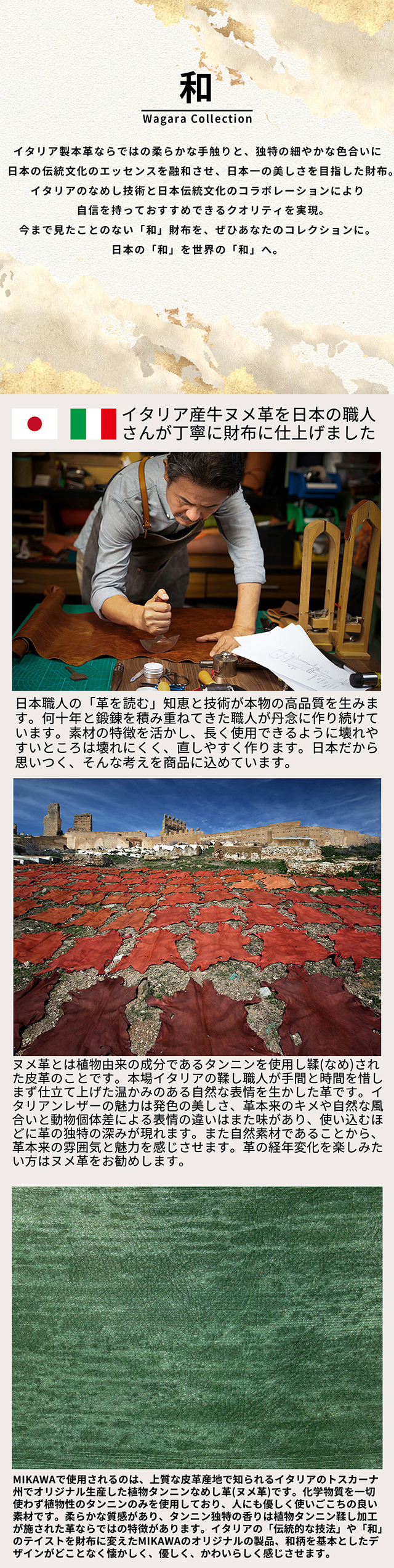 ● イタリアのなめし技術と日本伝統文化のコラボレーションにより 自信を持っておすすめできるクオリティを実現。 今まで見たことのない「和」財布を、ぜひあなたのコレクションに。 日本の「和」を世界の「和」へ。